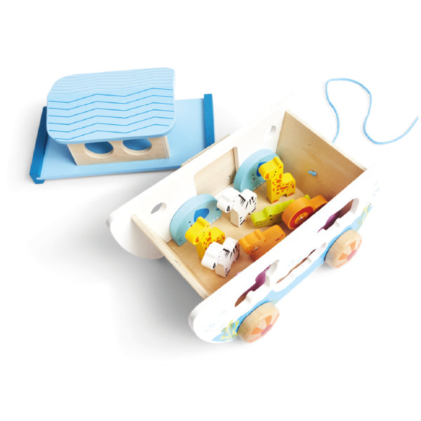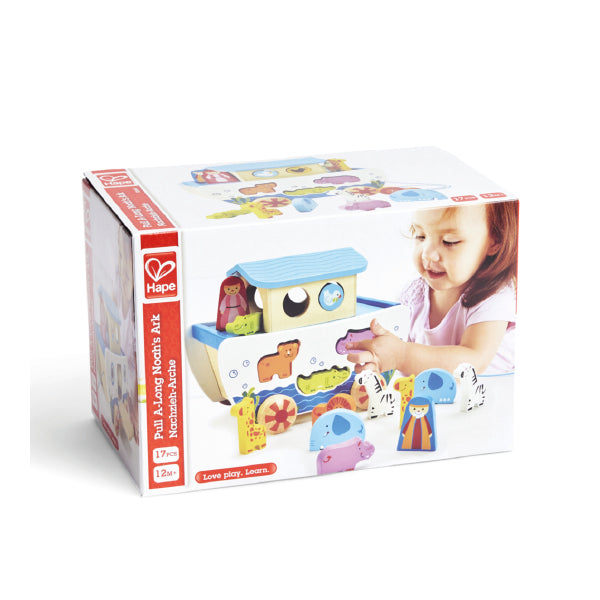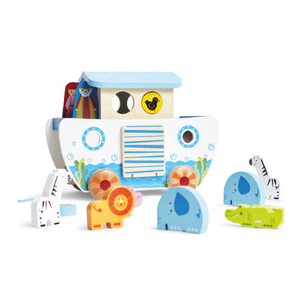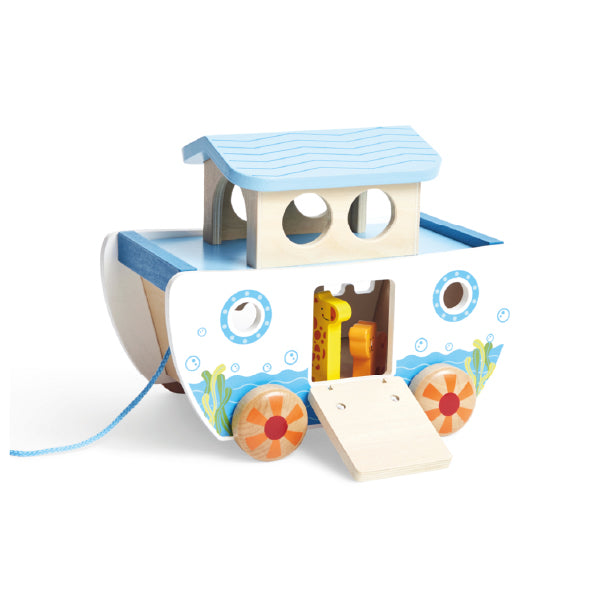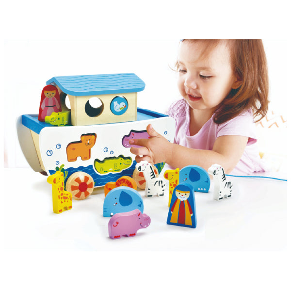 ¡Subid a los animales a bordo del arca de Noé! Los peques podrán jugar con los animales de madera incluidos o encajarlos en su sitio correspondiente del arca y llevarlos de paseo. ¡Se divertirán mucho mientras dan sus primeros pasos!