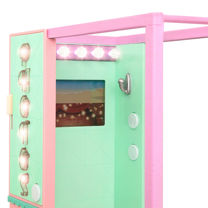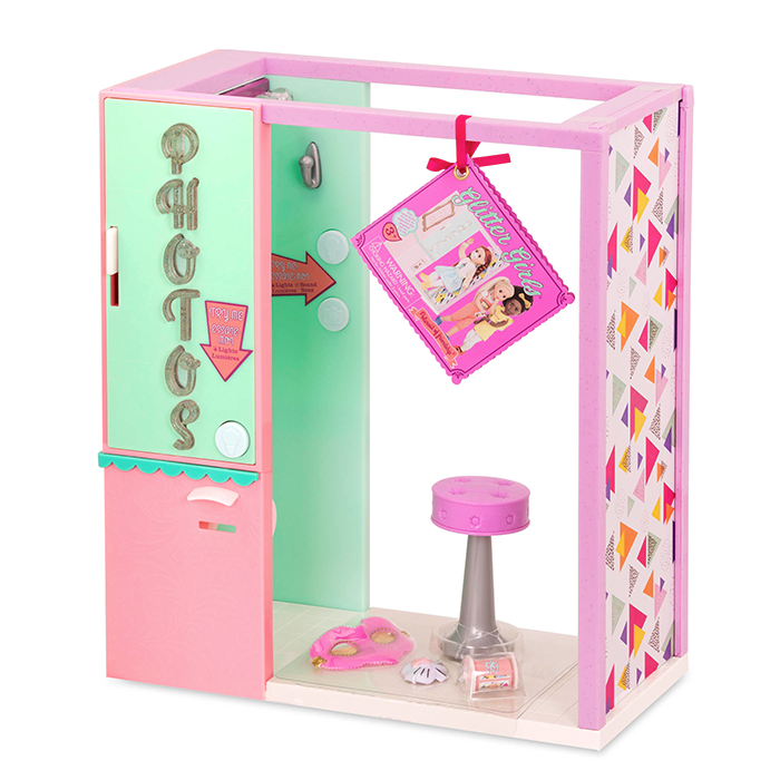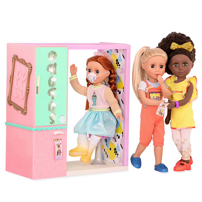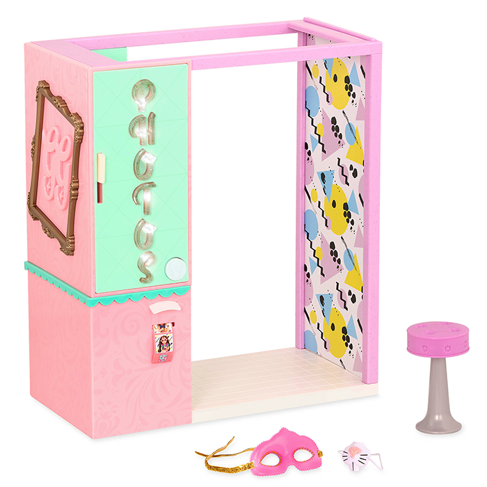 ¡Desde selfies hasta divertidas fotos con otras muñecas, celebra la amistad capturando los mejores momentos con esta cabina fotográfica! Cuenta con luces y sonidos que la hacen parecer de verdad, patrones de fondo reversibles, una nariz de conejo, una máscara , un rollo de fotos y un taburete móvil. La muñeca se vende por separado. *La cabina no saca fotos de verdad.