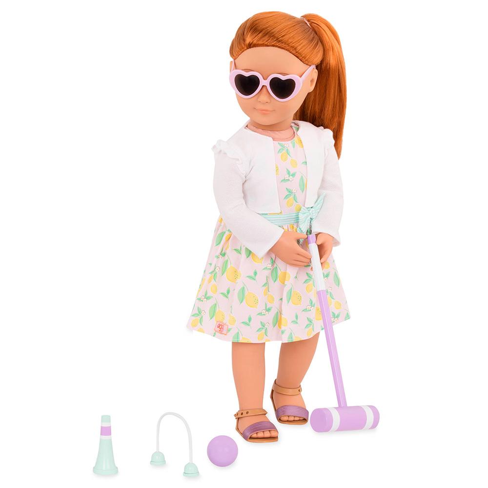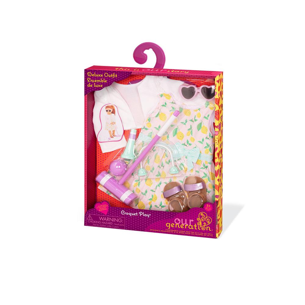 El croquet es uno de los deportes más antiguos y más elegantes del mundo. ¡Con esta distinguida tenida tu muñeca no se quedará atrás! Incluye un vestido, un chaleco, anteojos de sol, chalitas, un mazo de croquet, una bola, un arco y un marcador. *La muñeca se vende por separado.