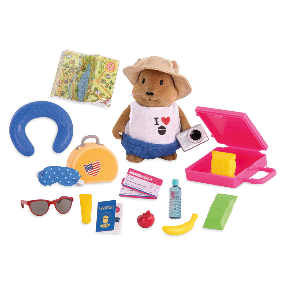 Este juego todo en uno viene con un lindo personaje de ardilla que quiere ser tu compañero de viaje. Está listo para un gran viaje, con sus maletas en miniatura, cámara, mapa y boleto. ¡También tiene un atuendo genial, que incluye un sombrero y anteojos de sol que puedes mezclar y combinar con otros Li'l Woodzeez! Hay muchos bocadillos para el viaje, así como una almohada para el cuello y una máscara para los ojos. ¿Listo para ir? ¡No olvide su pasaporte! El juego de viaje es un regalo ideal para los niños a los que les encanta usar su imaginación.