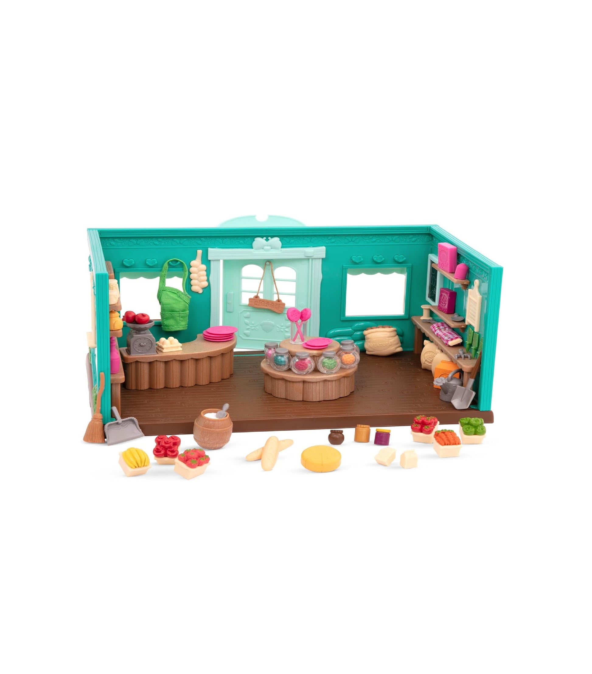 ¡Siempre es un día ajetreado en el mercado Honeysuckle Hollow! Este juego de juguetes tiene todos los accesorios que necesitas para un divertido día de juego de simulación. Hay mucha comida de juguete, por lo que sus compradores pueden llenar sus canastas con manzanas, frutillas, tomates y plátanos. Otros comestibles incluyen pan, leche, huevos y queso, así como varios frascos y latas. ¿Necesita pesar sus productos? ¡Póngalos en la escala de alimentos! Este juego también viene con herramientas de jardinería y accesorios de limpieza: ¡El Playset mercado Honeysuckle Hollow realmente es una ventanilla única! ¿Cuál de tus personajes animales de Li'l Woodzeez estará trabajando hoy? ¡Ayúdalos a atarse el delantal, girar el letrero y prepararse para los negocios!