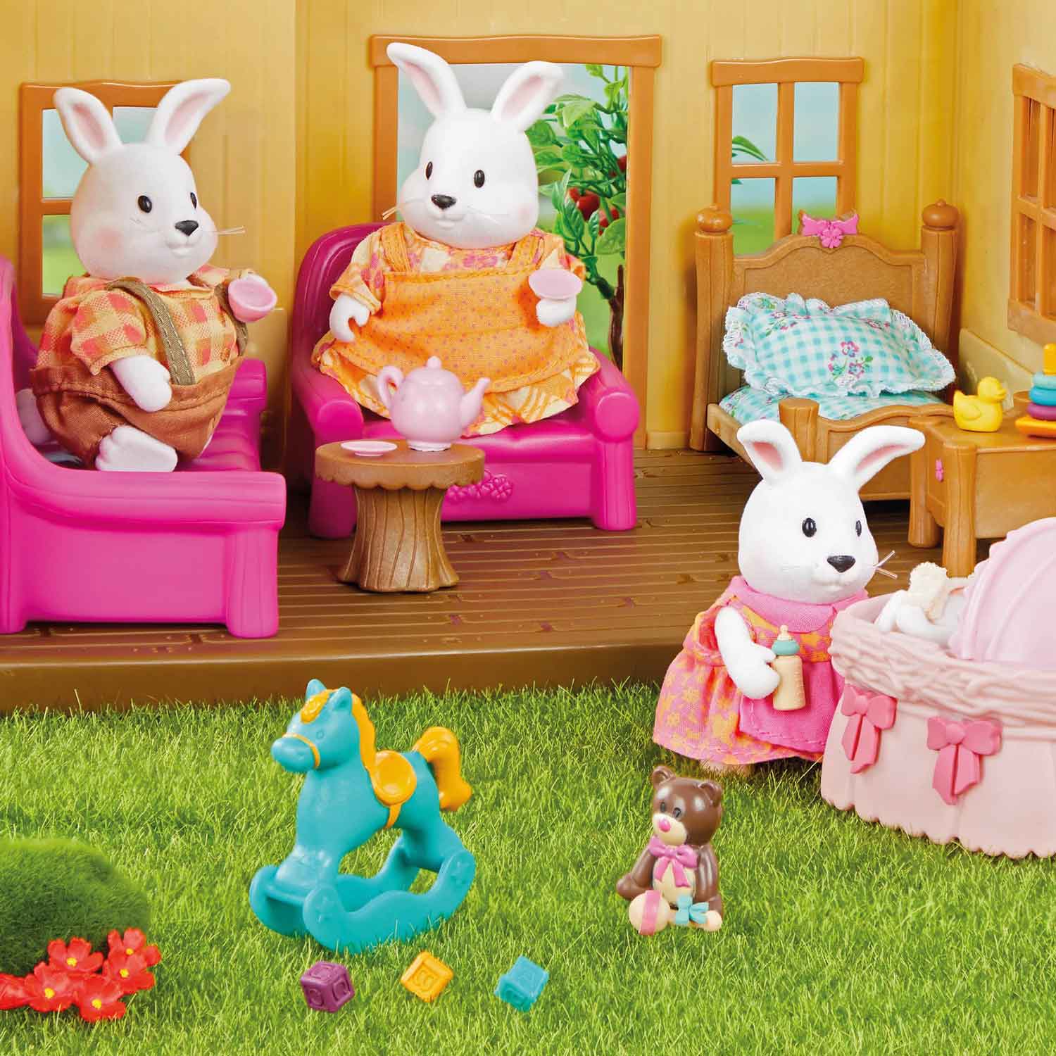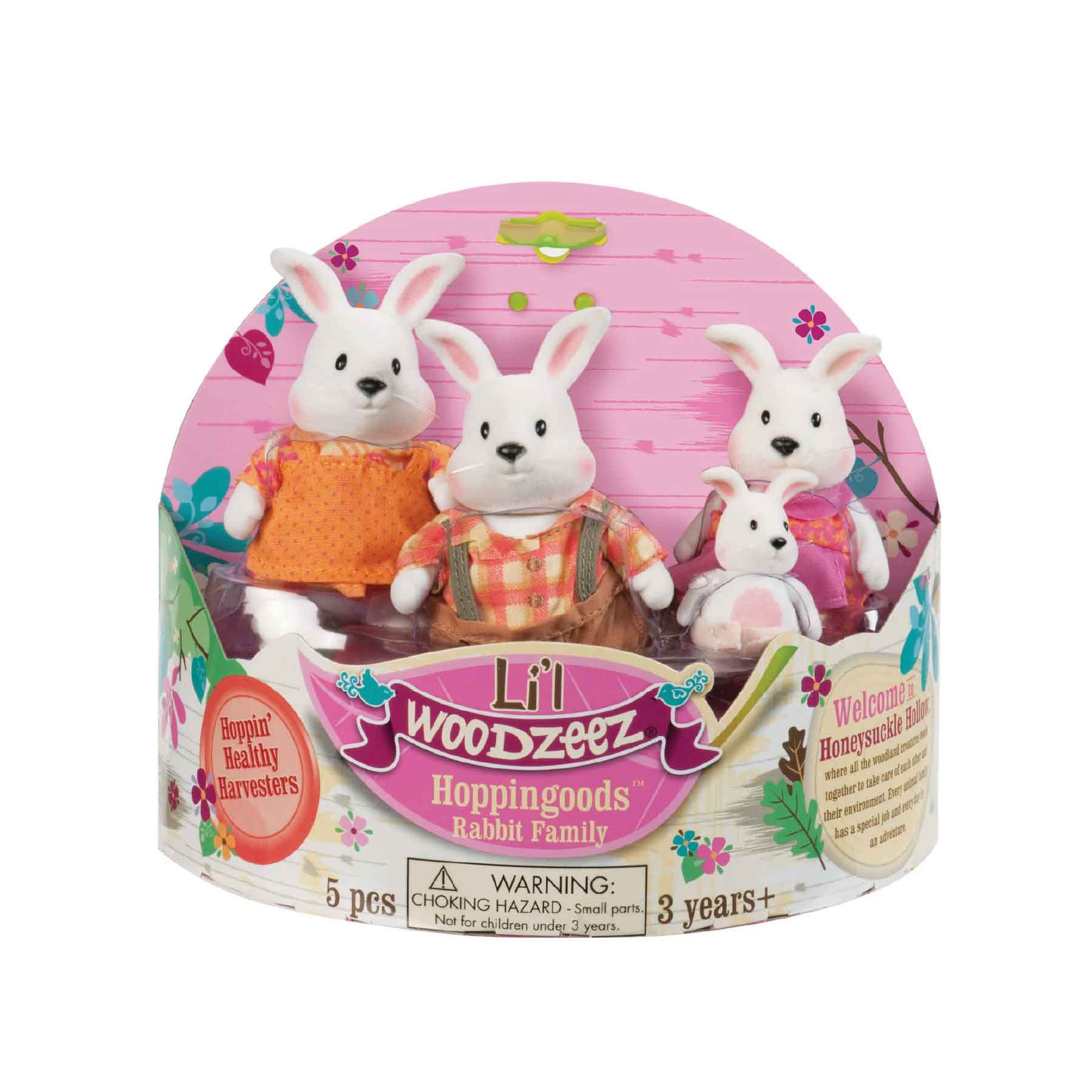 ¡Saluda a la familia de Conejos! Estos animales viven en Honeysuckle Hollow, un vecindario amigable donde todos los Li'l Woodzeez trabajan juntos y se divierten. Este set viene con cuatro personajes de conejos: mamá Amelia, papá Elliot y los niños Star y Theo. También se incluye un libro de cuentos familiar, para que pueda aprender más sobre las aventuras de los conejos. Estos pequeños juguetes son suaves al tacto y puedes mover la cabeza, los brazos y las piernas durante horas de juego. Cada figura viene con un atuendo colorido, que puedes mezclar y combinar con otros juguetes Li'l Woodzeez. ¡Usa tu imaginación para explorar el increíble mundo de Honeysuckle Hollow!