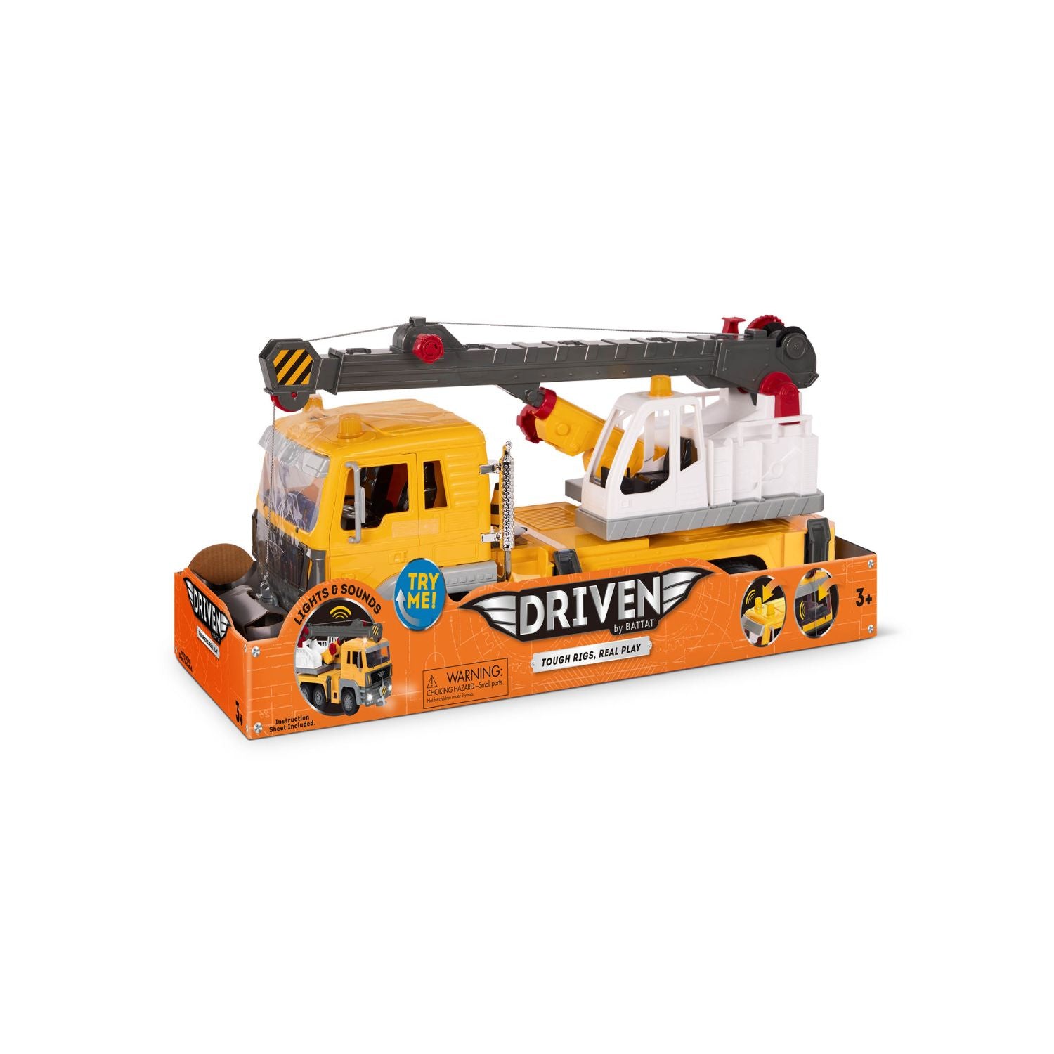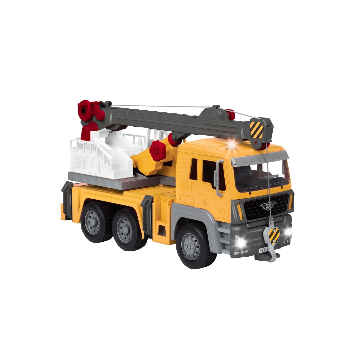 El Camión Grúa Amarillo Driven es un vehículo de construcción con brazo de grúa extensible que gira 360°, gancho funcional, patas de apoyo plegables, puertas que se abren para revelar un interior detallado, luces intermitentes y sonidos de motor y bocina auténticos. Es el juguete de construcción más realista y funcional de su categoría.