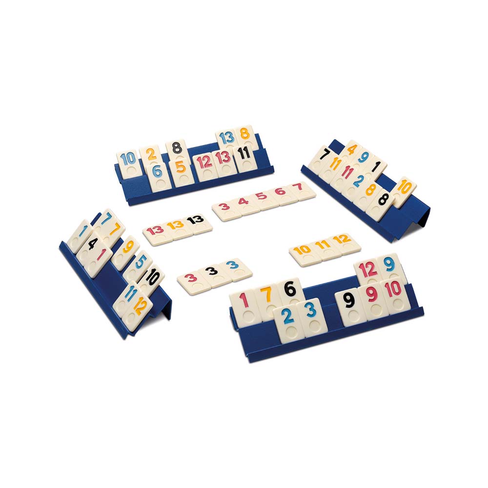 Sencillo y apasionante juego en el que cada jugador debe tratar de combinar sus fichas en grupos de tres o más para conseguir 100 puntos lo antes posible. Versión hasta 4 jugadores. Este set incluye caja de metal, fichas rummi y soportes para fichas.