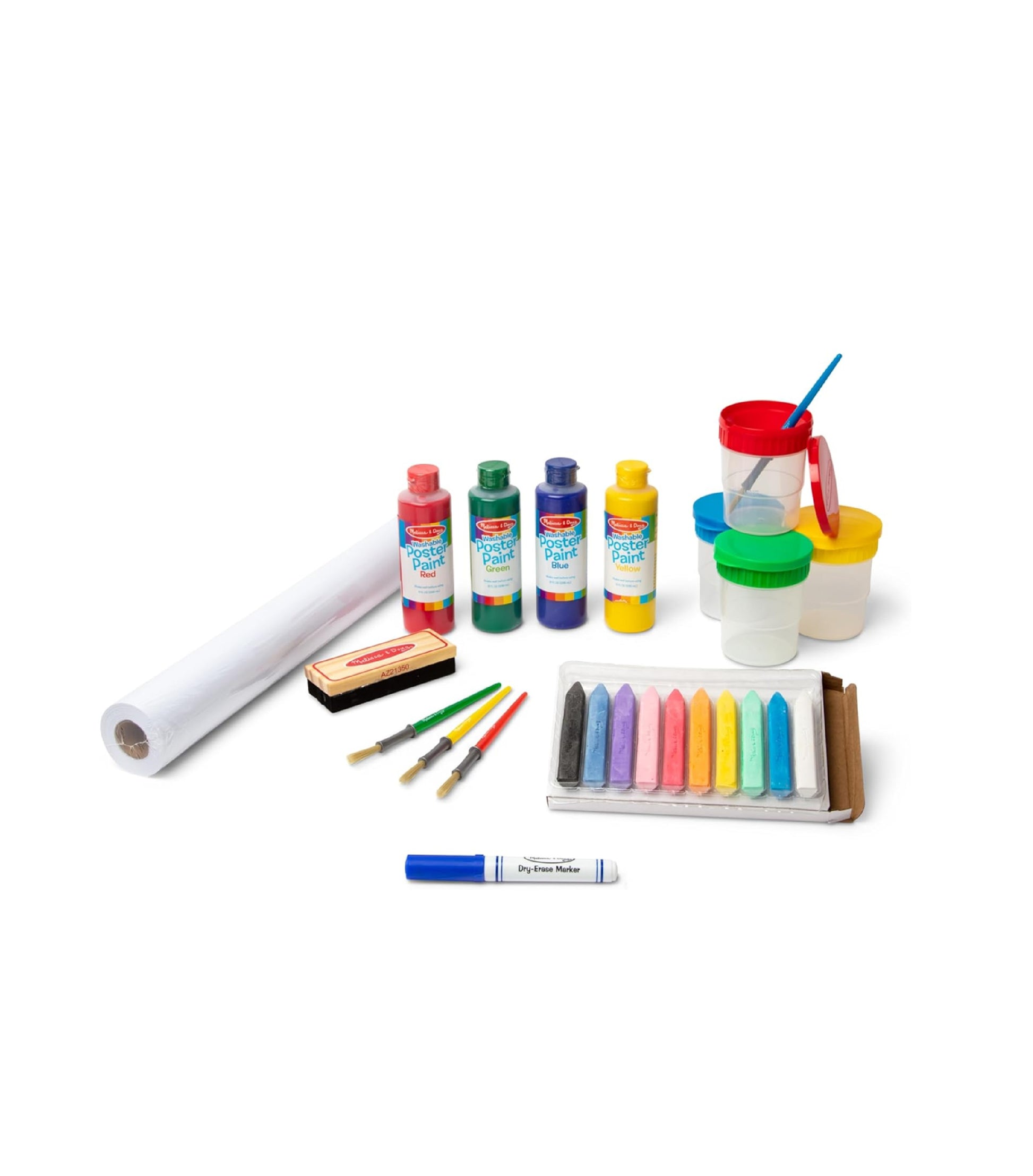 Este set contiene contiene todo lo que el pequeño artista necesita cuando llega la inspiración. Incluye 4 botellas de pintura, 4 vasos para mezclar, 4 pinceles, un rollo de papel un paquete de tizas, una borrador y un plumón. Este set es el complemento perfecto para el atril de Melissa & Doug.