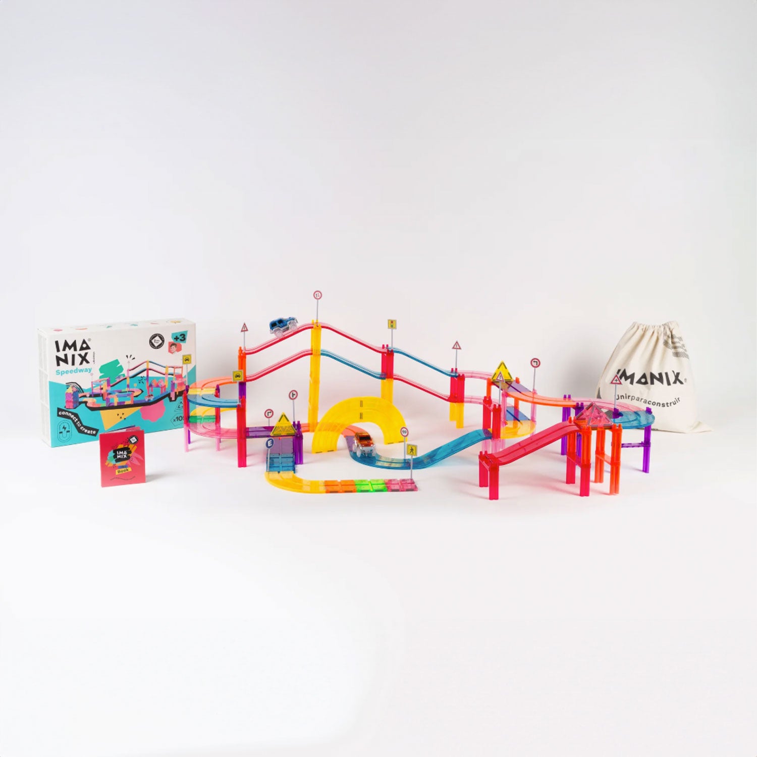 ¡Transfórmate en ingeniero, constructor y conductor con esta increíble pista de autos! Este set permite crear una gran pista de carreras con curvas, desniveles, puentes y auténticas señales de tráfico. Incluye 103 piezas geométricas de diferentes tamaños y colores que se unen fácilmente a través de imanes incrustados en los bordes, además de 2 autos para recorrer el circuito. Imanix es un juego didáctico, entretenido y educativo, que invita a crear todo tipo de figuras geométricas en 2D y 3D. Gracias a sus colores, formas y fácil manipulación, los niños podrán hacer infinitas construcciones, estimulando y desarrollando su creatividad e imaginación. La fuerza de los imanes hace que las piezas se atraigan fácilmente, permitiendo a los niños de todas las edades aprender conceptos de geometría y matemáticas. Este juguete estimula el cerebro y ayuda a trabajar la concentración. Compatible con todos los sets Imanix. *Todas las piezas están fabricadas con un material plástico, no tóxico, libre de BPA, tolueno y látex.
