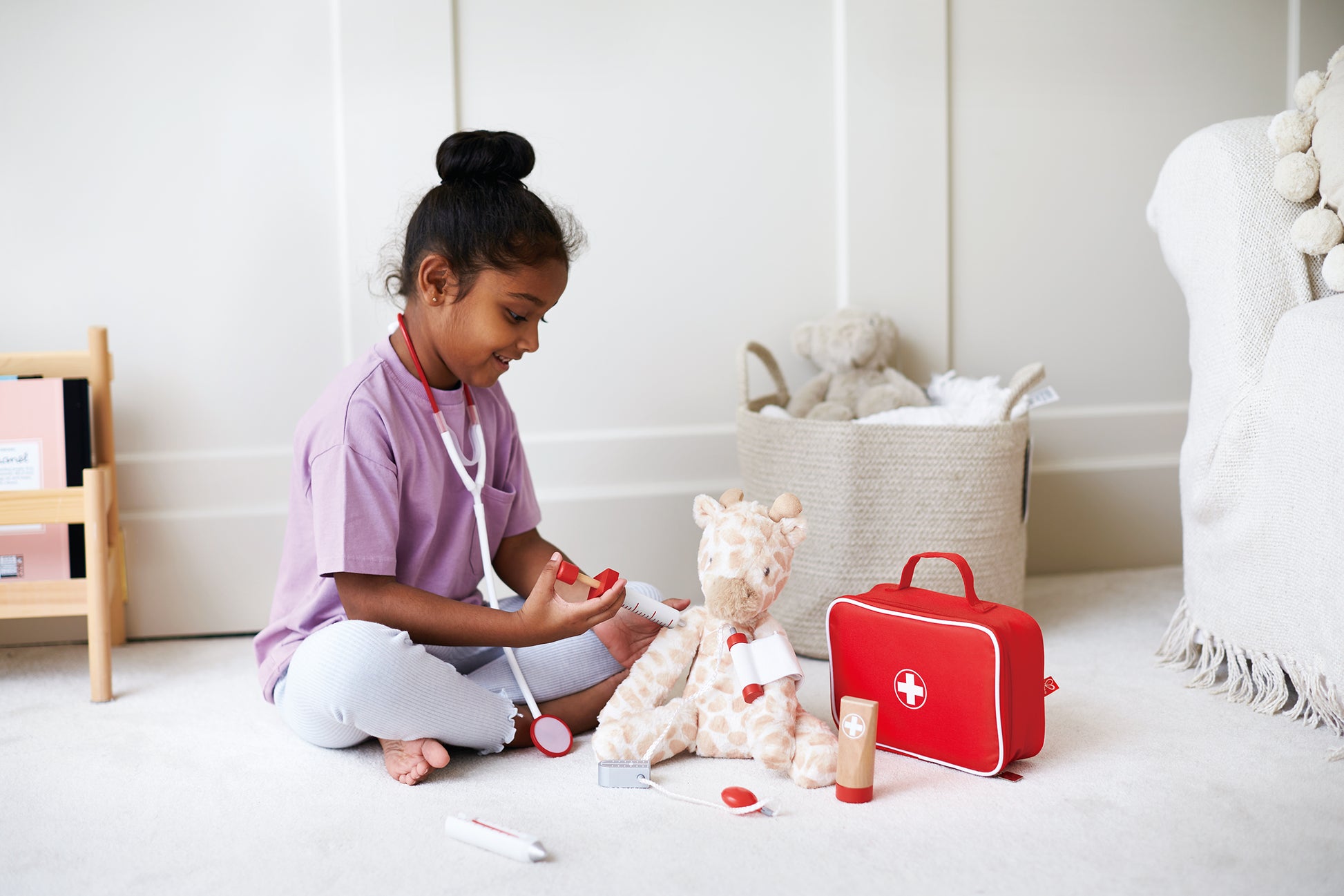 Kit de juego Doctor de Hape, diseñado para niños y niñas de 3 a 8 años. Incluye 7 piezas con instrumentos médicos de juguete en un estuche portátil, fabricados con materiales seguros y duraderos. Es ideal para estimular el juego de roles, la imaginación y el desarrollo de habilidades sociales y motoras finas mientras los pequeños se divierten jugando a ser doctores.