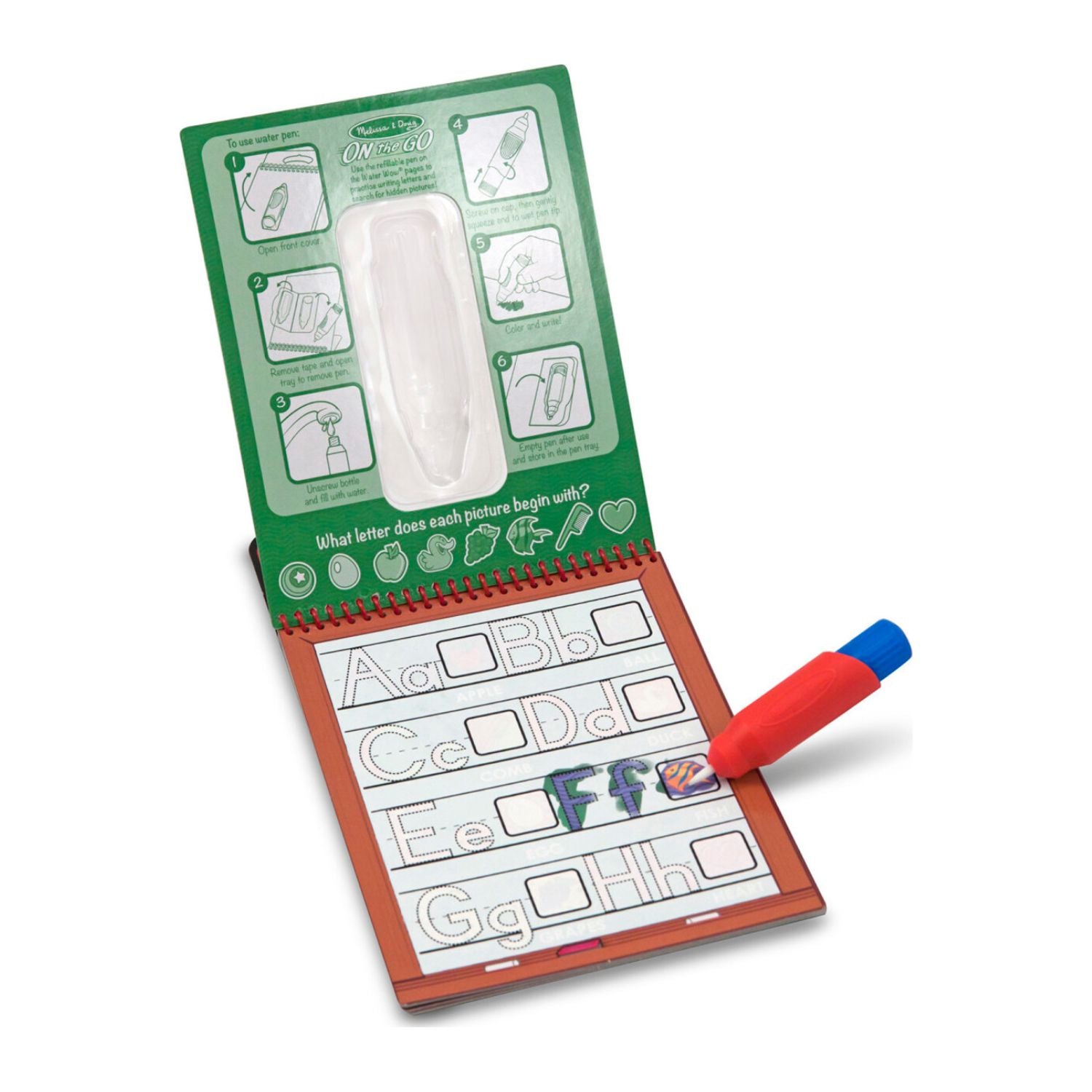 ¡Con este juguete los niños podrán pintar sin ensuciar! Contiene un libro con cuatro páginas reutilizables y un lápiz que se recarga con agua. Sólo utiliza el lápiz para pintar cada escena. ¡Los detalles y los colores aparecen con cada trazo! Luego, deja que la imagen se seque para poder pintarla una y otra vez. El lápiz tiene un diseño especial que hace que sea fácil de sujetar para los niños.
