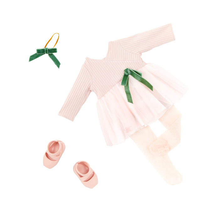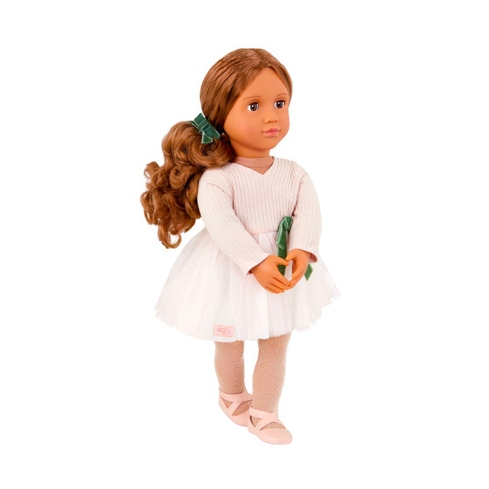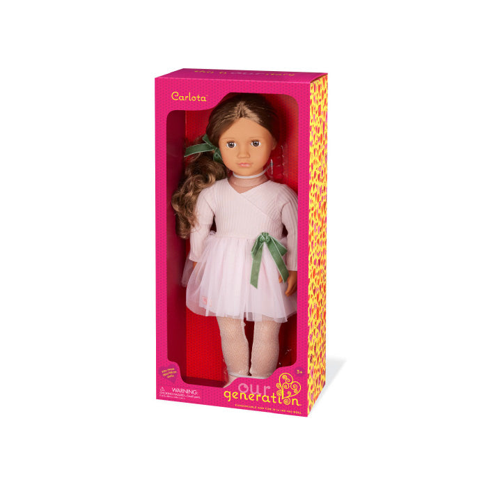 ¡Gira, da volteretas y haz piruetas hacia tus sueños con Carlota! Esta muñeca bailarina Our Generation tiene hermosos ojos marrones que se abren y se cierran con un cabello castaño largo y ondulado que es divertido de peinar antes de su recital. ¿Lista para ser el centro de atención? Carlota llega con un elegante vestido de ballet con un bonito lazo verde trébol, un par de medias y zapatillas de ballet. ¡También tiene un lazo para el cabello a juego que resalta su espíritu juguetón! Carlota tiene un cuerpo suave y abrazable y puede girar sus brazos y piernas cuando llega el momento de su gran actuación.