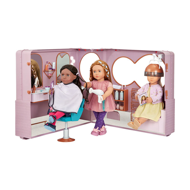 ¡Trae estilos divertidos a cada cliente de muñecas! Con luces divertidas, un sonido de secador de pelo y un remolque rodante, este juego permite que los peluqueros de tus muñecas creen una hermosa escena de salón en tus áreas de juego favoritas. Abra el tráiler e invite a los clientes a cambiarse el cabello. Comience lavando su cabello con champú en la estación de lavado con los artículos de belleza: ¡la manguera del fregadero se extiende para enjuagar el champú! Luego, sienta a tus muñecas en la silla para prepararlas para un recorte con la linda capa de salón, 3 clips de corte y tijeras. Luego séquese el cabello con el secador de pelo con capucha o el secador de mano. Ilumina el espejo mientras comienzas a explorar looks divertidos con el rizador y el cepillo para el cabello. ¡Y el remolque se pliega cuando llega el momento de viajar! Este juego de salón también incluye: 4 botellas de color de uñas, peine, tijeras, espejo, 3 tubos de tinte para el cabello, tazón para mezclar, cepillo para tinte, acondicionador, recipiente para mascarilla para el cabello, botella de aceite, revelador para el cabello, gel, 2 botellas de spray, cepillo de uñas, toalla, difusor de cabello y revista. (Las muñecas se venden por separado)