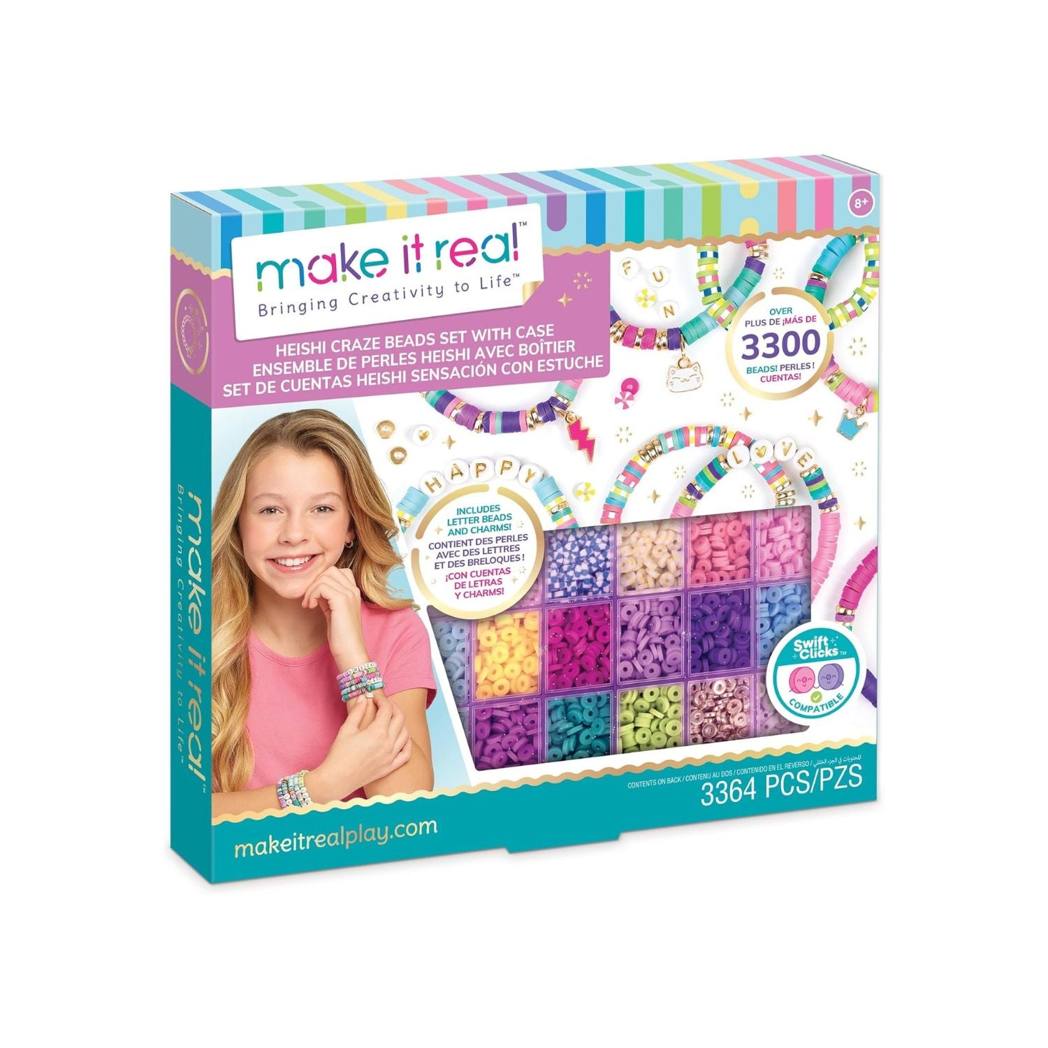 ✨🌈 ¡Da vida a la imaginación con el colorido Set de Cuentas Heishi Make It Real! Con más de 3300 piezas y un práctico estuche organizador, este kit permite crear pulseras y accesorios únicos usando cuentas vibrantes, cuentas con letras y encantadores charms. Perfecto para niñas, niños y preadolescentes que aman diseñar y expresarse, ofrece horas de creatividad práctica mientras combinan colores y crean mensajes personalizados. 💖🎨 Ideal como regalo para cualquier ocasión, este set convierte cada creación en un momento lleno de diversión y estilo. 🧵✨