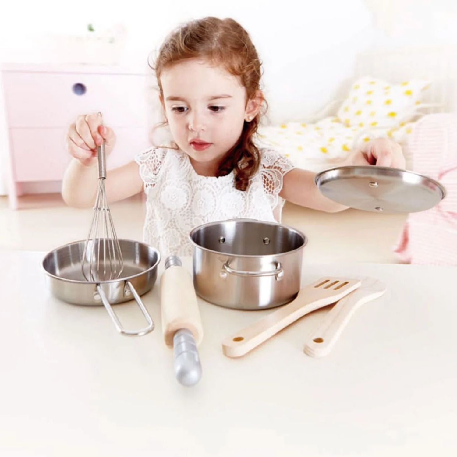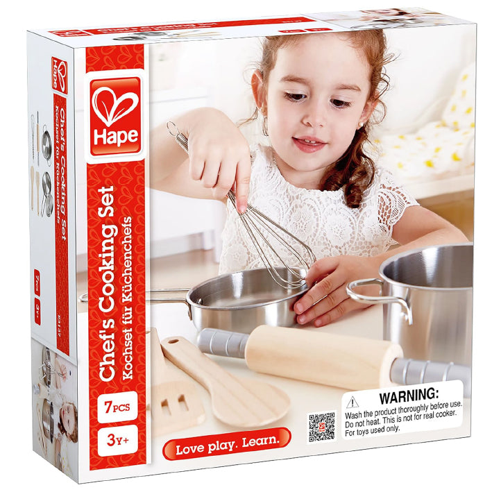 Este completo set de cocina es perfecto para los pequeños chefs en casa. Incluye una olla, una sartén, batidor de metal, uslero y utensilios de madera, ideales para recrear recetas imaginarias y disfrutar de horas de juego simbólico.