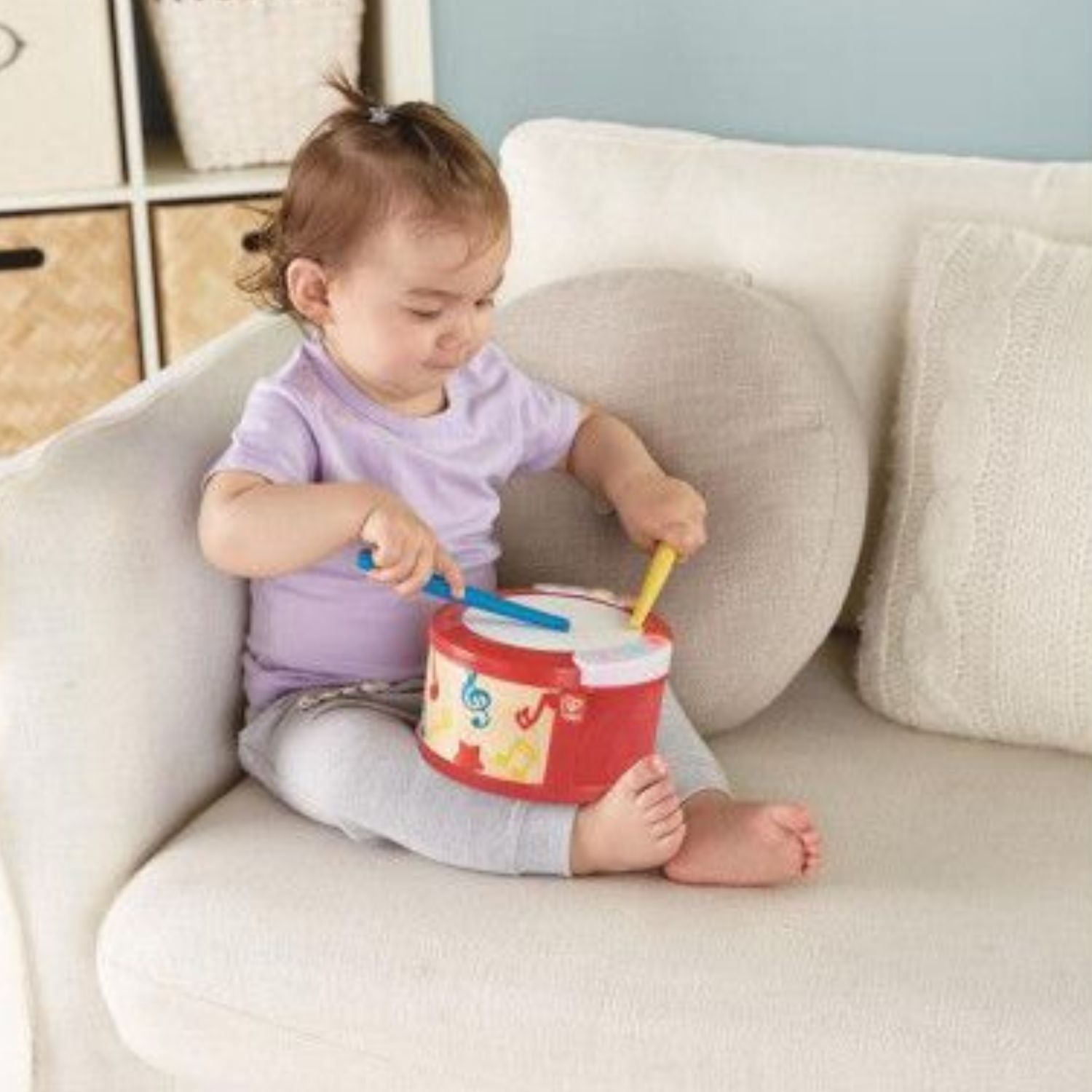 ¡Que suenen los tambores! Permite que tu peque entre en contacto con la música por primera vez con este magnífico tambor infantil. El suave sonido del tambor de juguete y las luces intermitentes son perfectas para desarrollar el interés por la música y las habilidades motoras finas.
