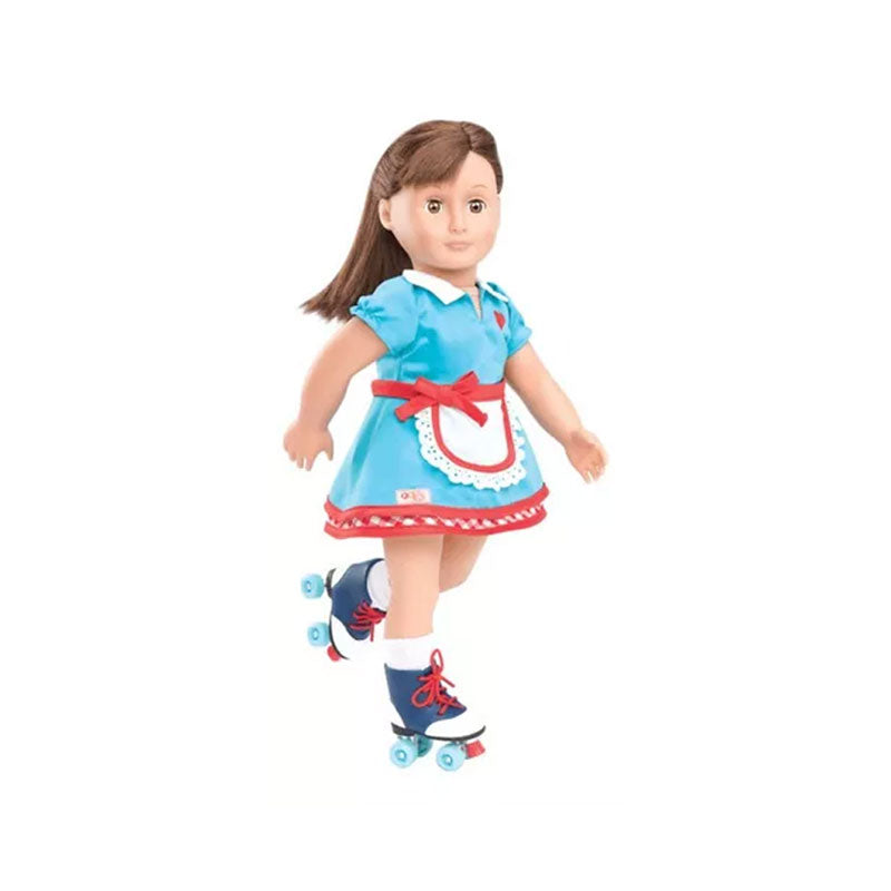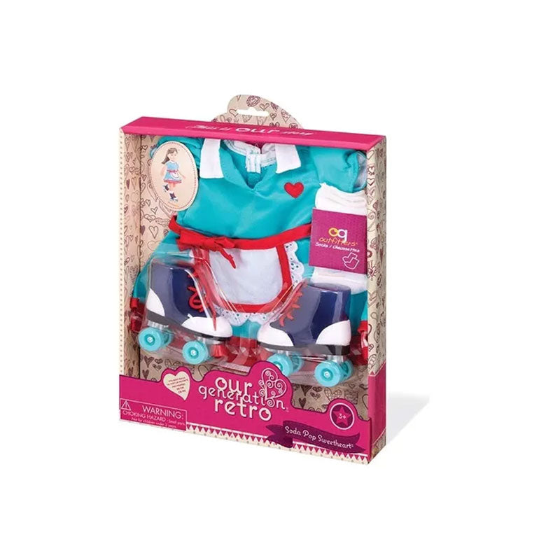 ¡Tus muñecas se deslizarán hacia la aventura mientras sirven horas de diversión en el traje de camarera retro! ¡Este adorable uniforme de camarera de estilo vintage para muñecas presenta detalles clásicos y todos los ingredientes para un estilo atemporal! Esta tenida incluye un vestido, un delantal, unos patines y calcetines.
