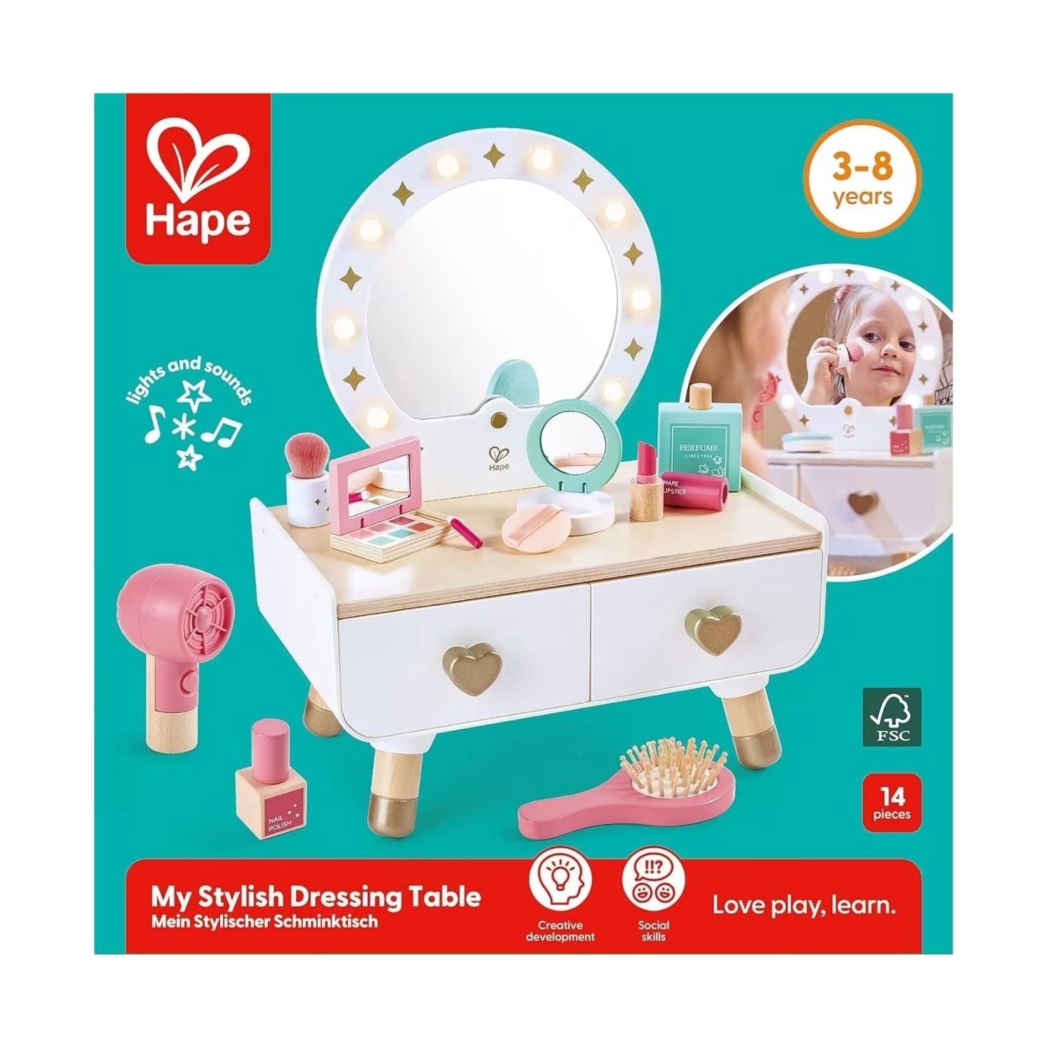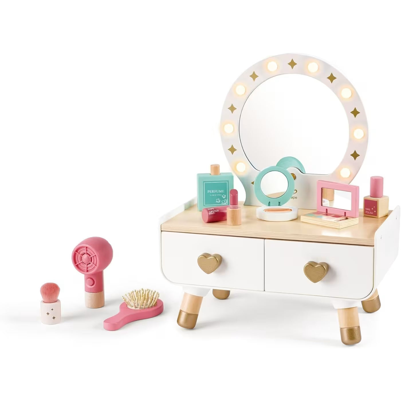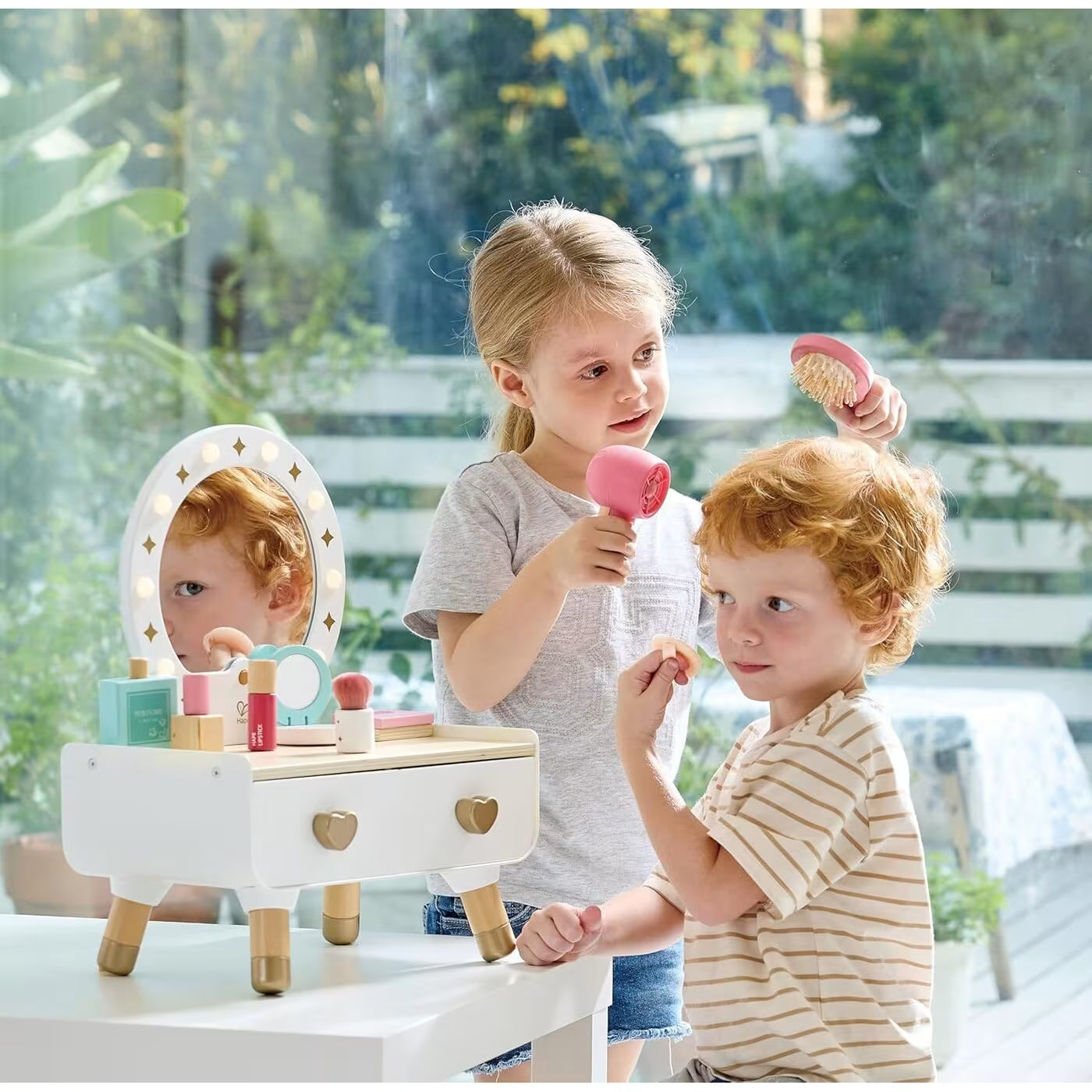 Un tocador de ensueño. Entre espejos, cajones y accesorios, los niños podrán imaginar mil historias de glamour y juego de roles. Cada detalle invita a la creatividad, al juego simbólico y a sentirse protagonistas de su propio cuento.