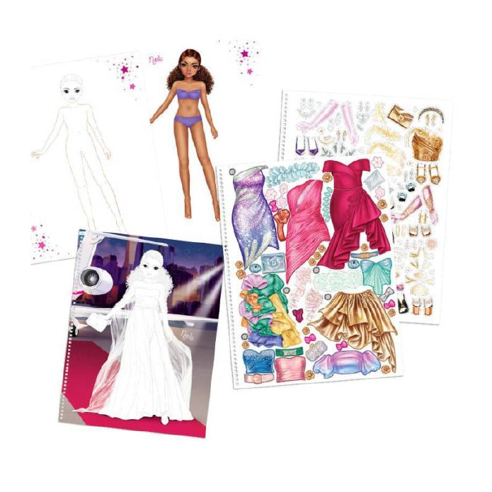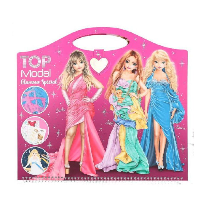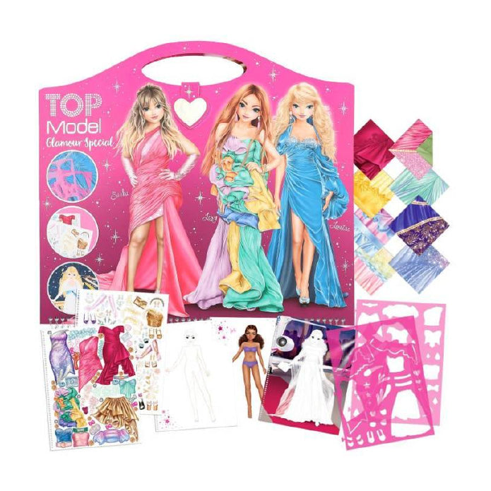 Glamour puro a lo largo de 52 páginas. El cuaderno creativo "Glamour Special" de TOPModel lleva encuadernación de gusanillo ¡y tiene un asa que resulta muy práctica para transportarlo! Incluye 2 hojas repletas de pegatinas, 8 páginas estampadas con diseños de telas y 2 plantillas para crear looks maravillosos. ¡Es bellísimo!